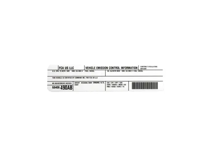 We’re your trusted source for the genuine parts and accessories you need to spruce up your Chrysler, Dodge, Jeep, Ram Trucks, or FIAT vehicle. You can be sure that your vehicle will perform up to its potential, mile after mile, with this Vehicle Emission Control Information Label for your 2019 Ram 3500 vehicle. Mopar Parts & Accessories Limited Warranty.